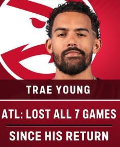自特雷-杨12月19日复出后,老鹰7战全败跌至东部第10