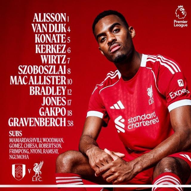 利物浦首发:1-阿利松、4-范戴克、5-科纳特、6-凯尔凯兹、7-维尔茨、8-索博斯洛伊、10-麦卡利斯特、12-布拉德利、17-琼斯、18-加克波、38-赫拉芬贝赫