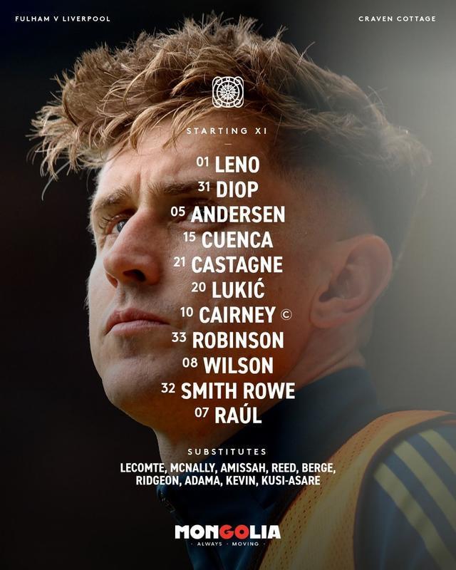 富勒姆首发:1-莱诺、31-伊萨-迪奥普、5-约西姆-安诺生、15-豪尔赫-昆卡、21-卡斯塔涅、20-萨萨-卢基奇、10-凯尔尼、33-罗宾逊、8-哈里-威尔逊、32-史密斯-罗、7-劳尔-希门尼斯
