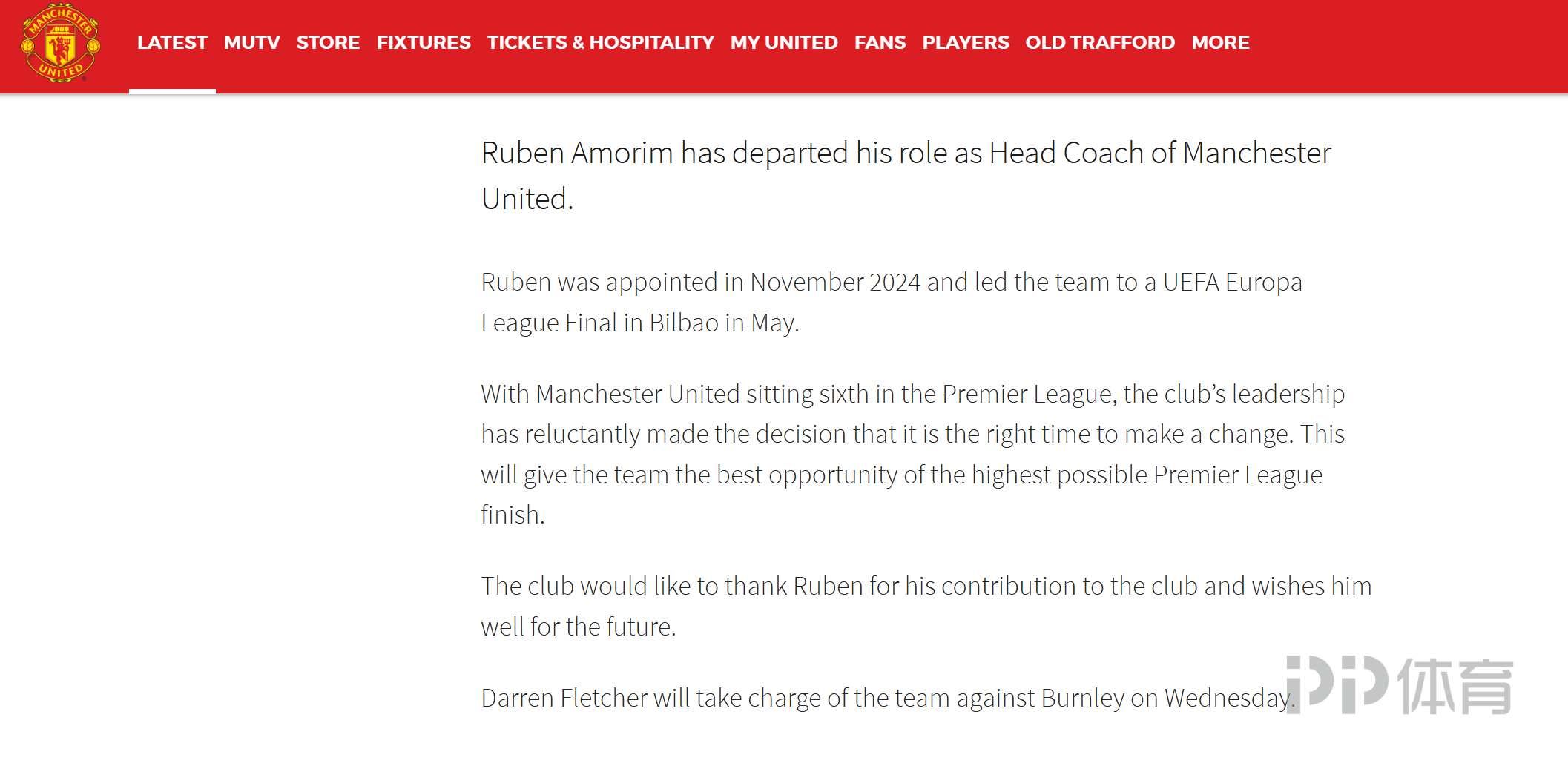 曼联官方宣布,鲁本-阿莫林不再担任球队主教练,达伦-弗莱彻担任临时主帅。官方公告:
