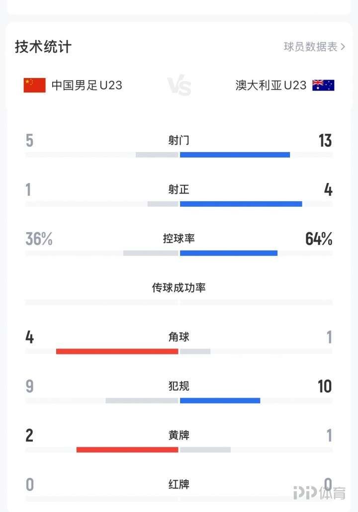 U23国足vs澳大利亚全场数据:射门数5-13,控球46开