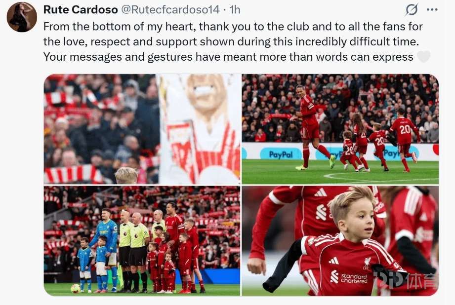 赛后,若塔的妻子Cardoso更新了社交媒体,发文向大家致谢。她的社媒配文这样写道:“谨以此心,感谢利物浦俱乐部以及所有球迷——在这段异常艰难的日子里,你们给予我的关爱、尊重与支持,我牢记于心。你们发来的每一条讯息、付出的每一份心意,都难以用言语形容其分量。”