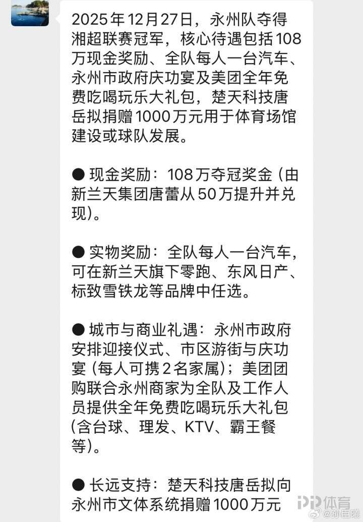 2025年湖南省足球联赛(湘超)在昨日落下帷幕,最终永州队夺得今年的冠军,在球队夺冠之后网络社交平台中也流出了永州队当地政府、企业对球队的奖励,其中核心奖励包含全队每人1台汽车及市区游街庆贺。