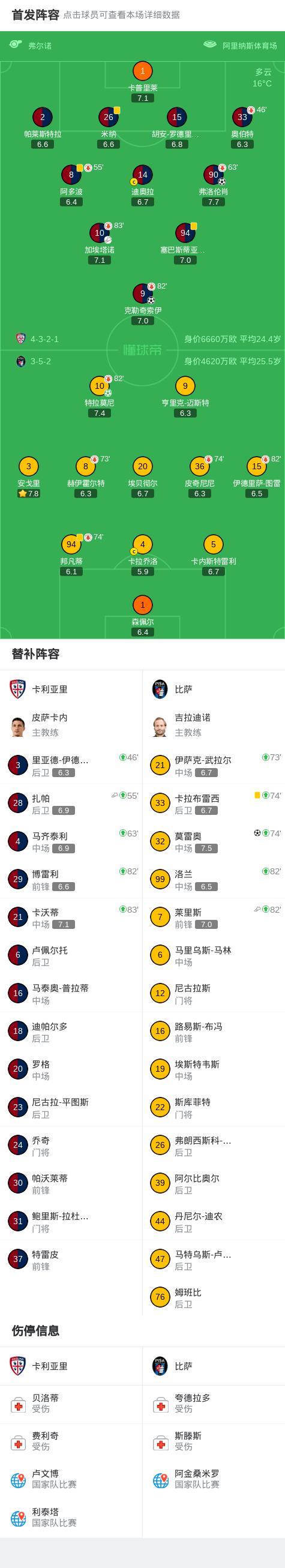 卡利亚里2-2比萨,特拉莫尼破门,莫雷奥扳平比分