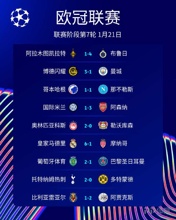 欧冠第7轮首日比赛结束,全部结果如图。