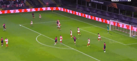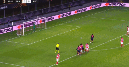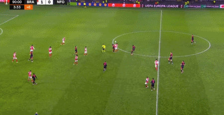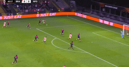 第54分钟,耶茨回防,不慎将球踢进自家球门,布拉加1-0诺丁汉森林