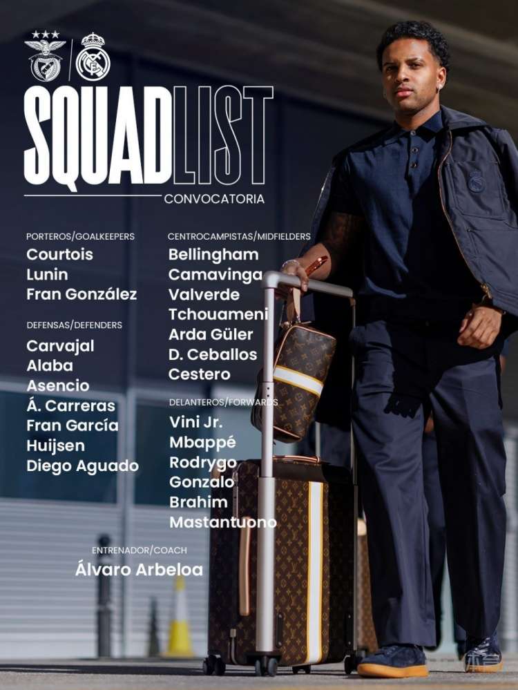 皇马客战本菲卡大名单:维尼修斯、姆巴佩、贝林厄姆领衔