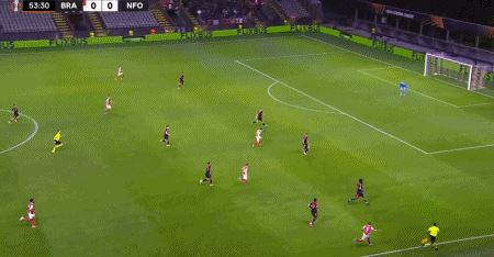 第54分钟,耶茨回防,不慎将球踢进自家球门,布拉加1-0诺丁汉森林