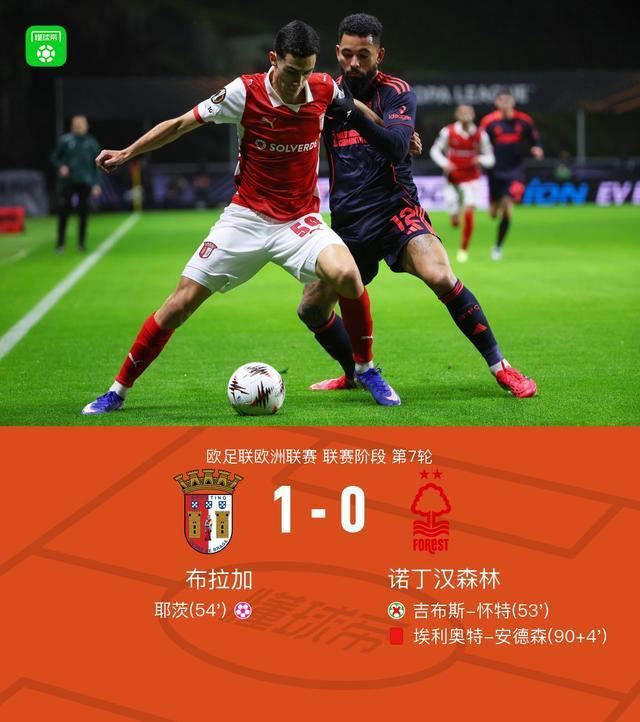 北京时间1月23日欧足联欧洲联赛联赛阶段第7轮,布拉加对阵诺丁汉森林。诺丁汉森林球员吉布斯-怀特主罚点球未能命中,随后耶茨不慎自摆乌龙,埃利奥特-安德森在比赛补时阶段被直接罚令出场。最终比分布拉加1-0战胜诺丁汉森林。