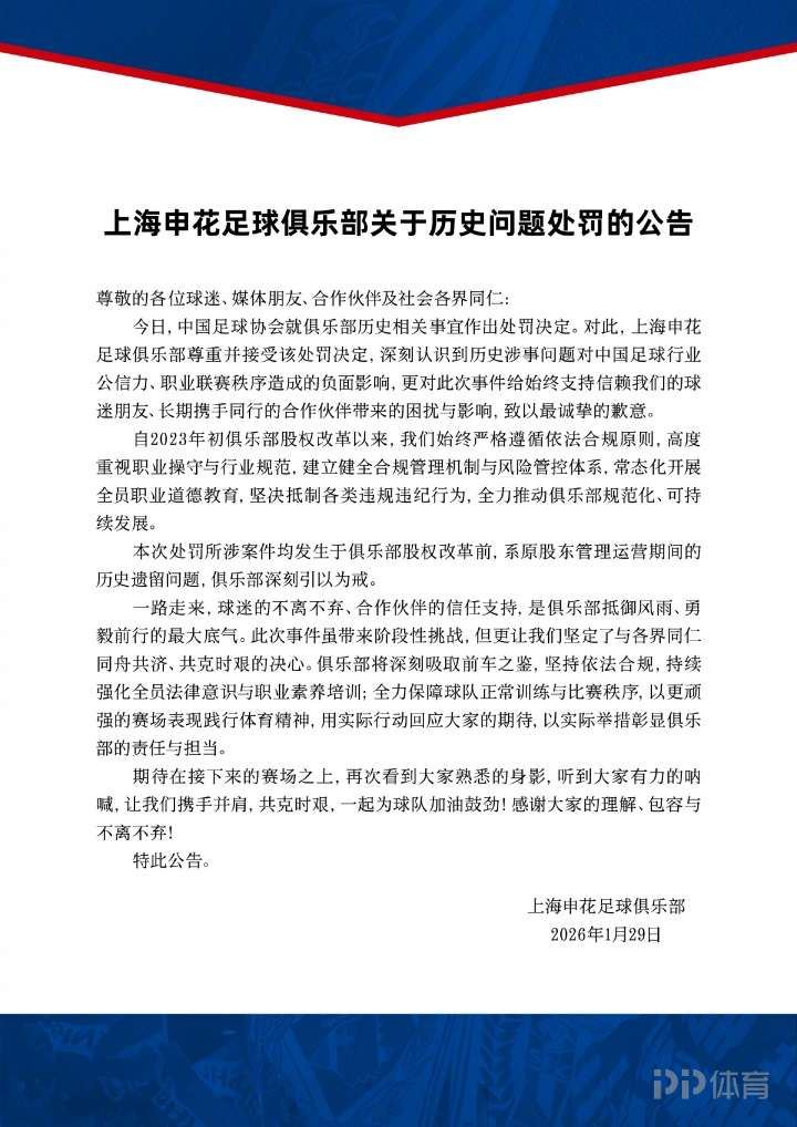 今日,中国足球协会就俱乐部历史相关事宜作出处罚决定。对此,上海申花足球俱乐部尊重并接受该处罚决定,深刻认识到历史涉事问题对中国足球行业公信力、职业联赛秩序造成的负面影响,更对此次事件给始终支持信赖我们的球迷朋友、长期携手同行的合作伙伴带来的困扰与影响,致以最诚挚的歉意。