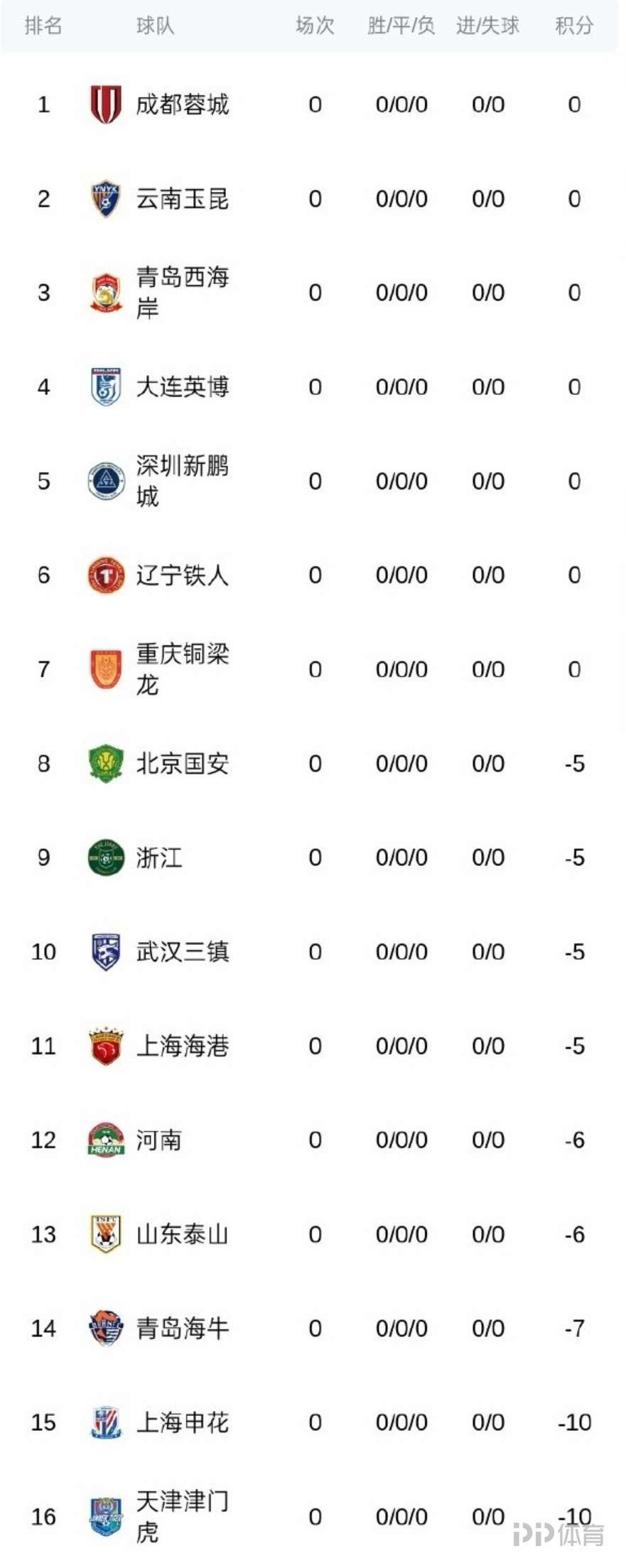 2026赛季中超初始积分榜:申花、津门虎-10分垫底