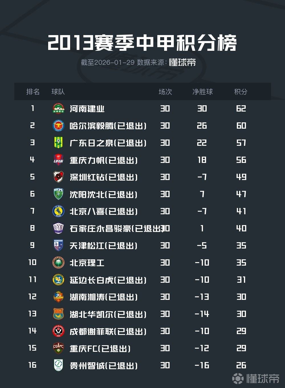 2013年参加中甲的所有球队里,现存球队仅剩河南建业(河南)和北京理工,其中河南今年被扣6分并罚款60万元,北京理工未受到处罚。