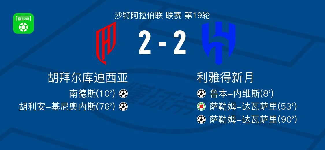 胡拜尔库迪西亚2-2利雅得新月,鲁本-内维斯打破僵局,萨勒姆-达瓦萨里扳平