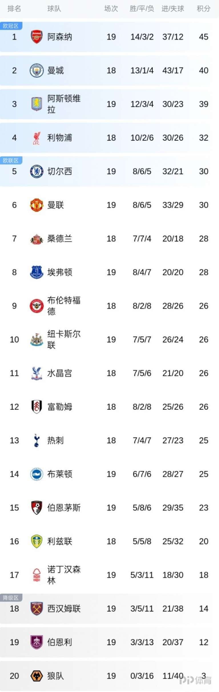英超积分榜:阿森纳先赛5分领跑 曼城维拉利物浦前四