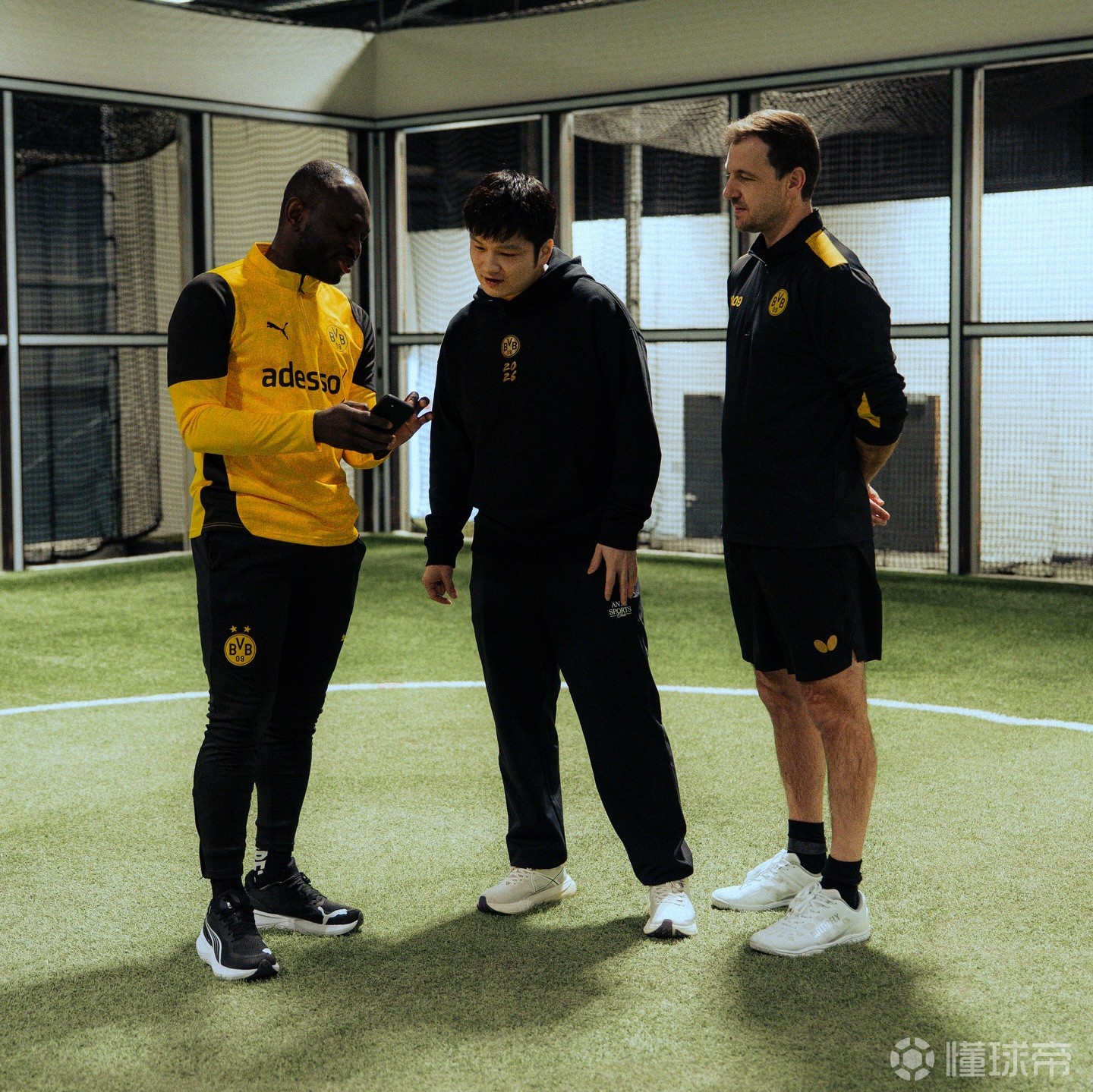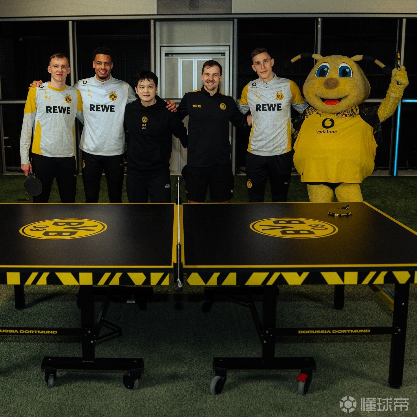 跨界互动,樊振东和施洛特贝克、恩梅加等多特球员一起打乒乓球