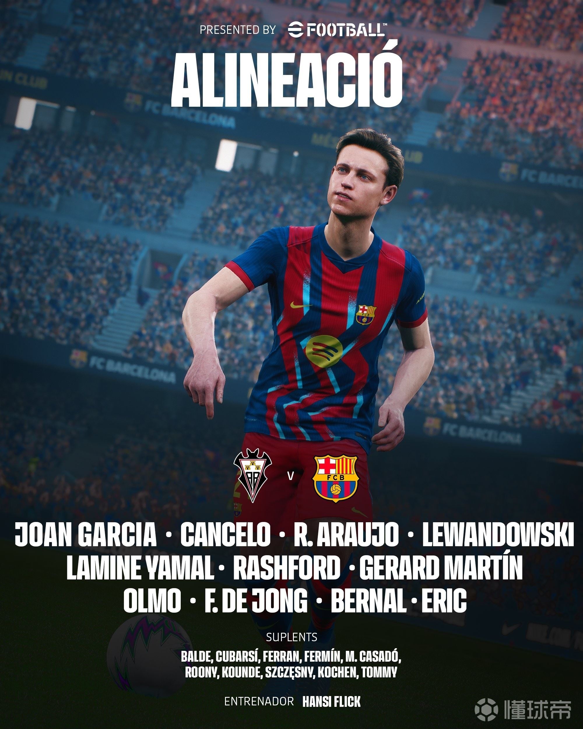 巴塞罗那首发:13-霍安-加西亚、2-坎塞洛、18-赫拉德-马丁、24-埃里克-加西亚、4-阿劳霍、21-弗朗基-德容、22-马克-贝尔纳尔、20-奥尔莫、10-亚马尔、14-拉什福德、9-莱万多夫斯基