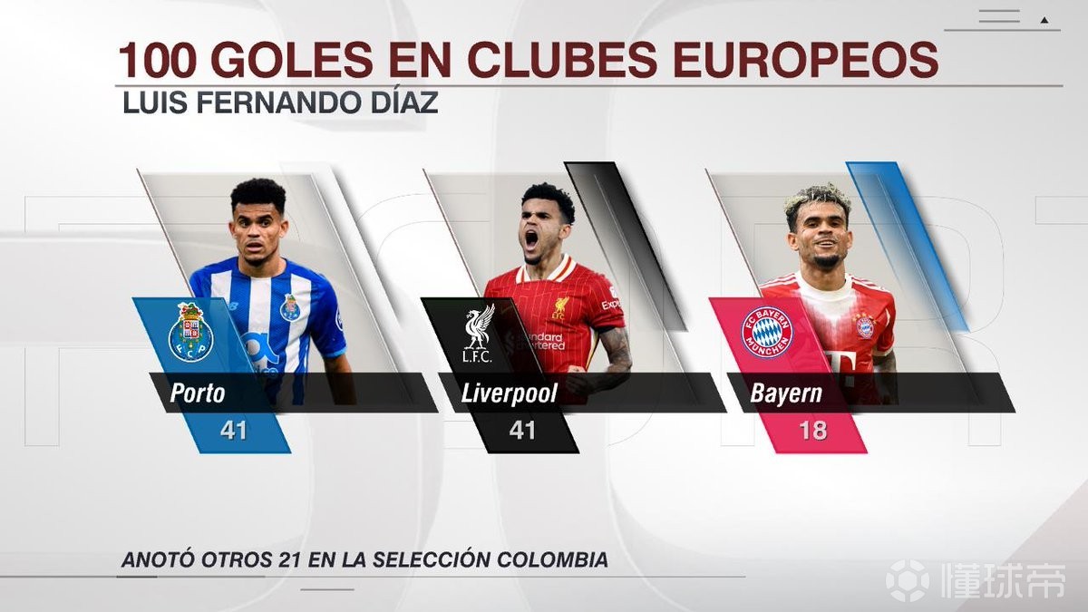 里程碑,路易斯-迪亚斯在欧洲足坛已打入100球
