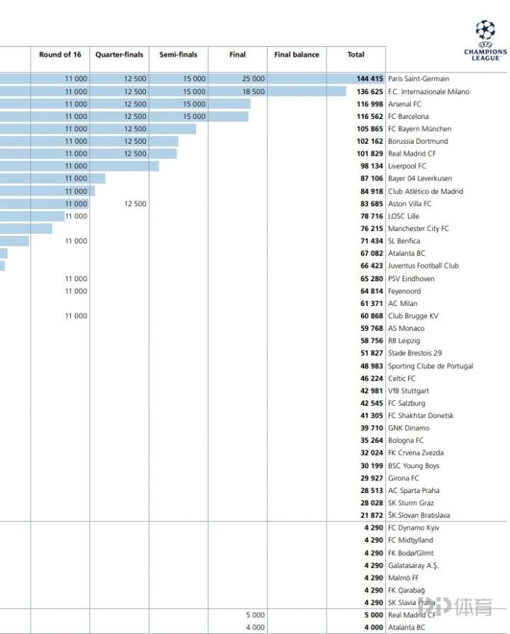 欧足联公布了上赛季的欧冠各队奖金收入,2024/25赛季欧冠奖金前10: