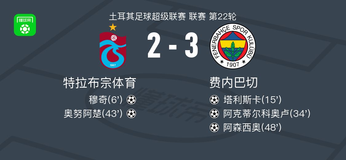 北京时间2月15日土耳其足球超级联赛 联赛 第22轮,特拉布宗体育主场对阵费内巴切。特拉布宗体育穆奇破门,奥努阿楚破门。费内巴切塔利斯卡破门,阿克蒂尔科奥卢破门,阿森西奥破门。最终比分特拉布宗体育 2-3 费内巴切。