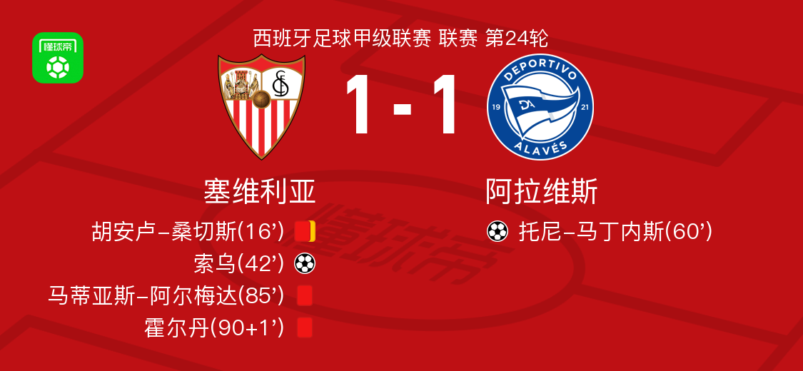 北京时间2月15日西班牙足球甲级联赛 联赛 第24轮,塞维利亚主场对阵阿拉维斯。塞维利亚索乌破门。阿拉维斯托尼-马丁内斯破门。最终比分塞维利亚 1-1 阿拉维斯。