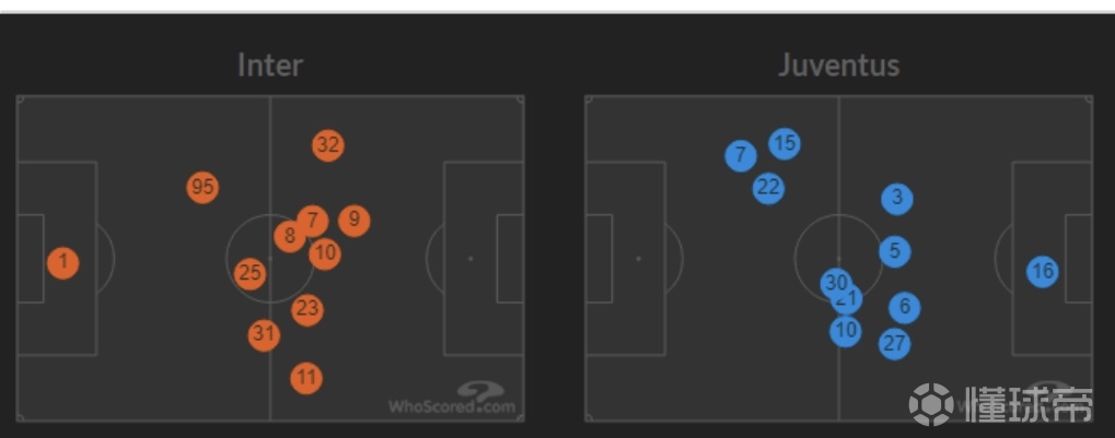 既然迪马尔科最近状态火热,那本场比赛,尤文图斯肯定要严密防守国米左路主攻方向,派出7号小孔塞桑、22好麦肯尼、15号卡卢卢对迪马尔科、巴斯托尼进行高位压迫,迪马尔科在己方半场16次传球仅成功10次。尤文图斯的2粒进球,也是来自于麦肯尼在国米左侧的2次助攻。
