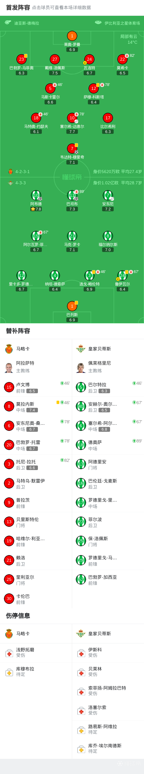 北京时间2月16日西班牙足球甲级联赛 联赛 第24轮,马略卡主场对阵皇家贝蒂斯。上半场,安东尼兜射被扑出,阿布德补射建功。安东尼直塞助攻,巴坎布小角度破门。下半场,达德尔助攻,穆里奇扳回一城。全场比赛结束,贝蒂斯2-1客场击败马略卡。