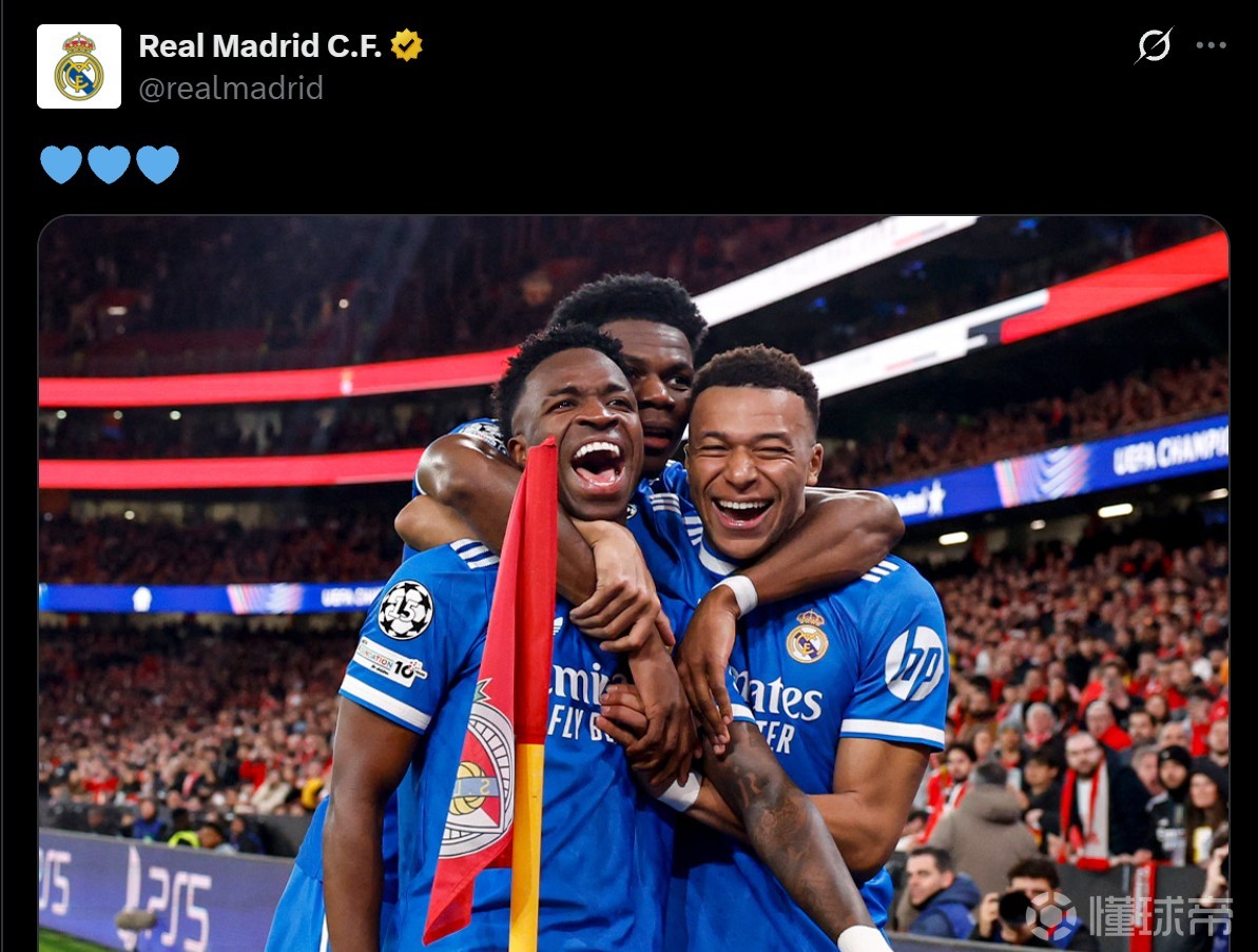 比赛第二天早上,皇马官方社媒发布第一条动态,晒出维尼修斯、姆巴佩、楚阿梅尼拥抱庆祝的照片,并配上了