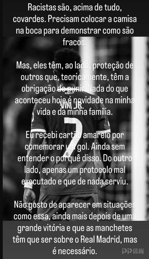 皇马1-0击败本菲卡赛后,维尼修斯更新社媒,就比赛中与普雷斯蒂安尼的冲突表态。